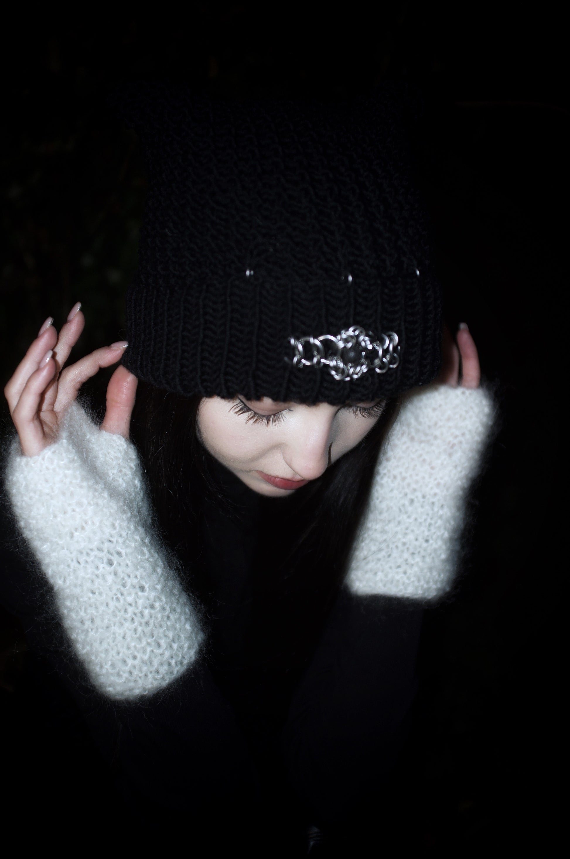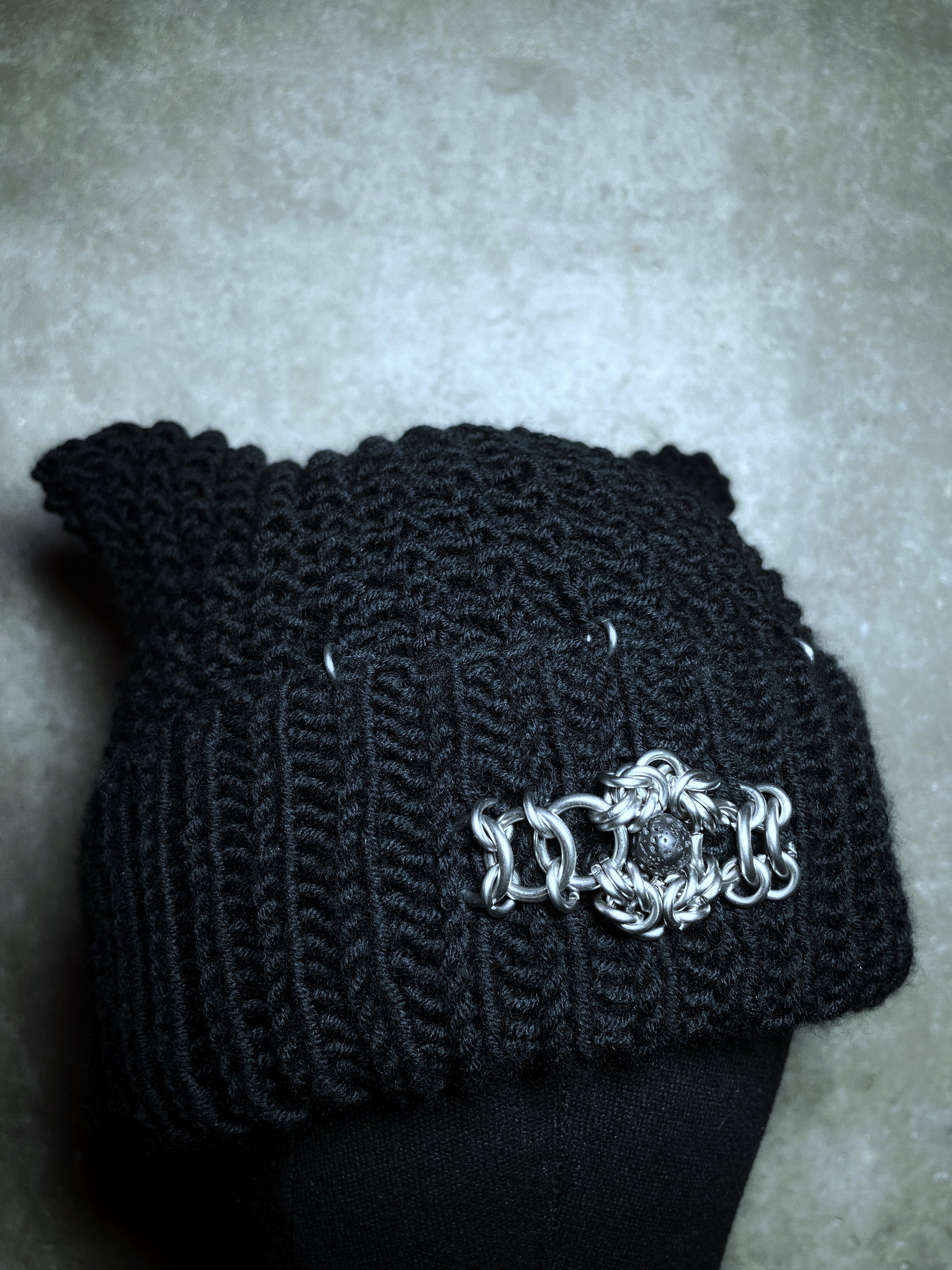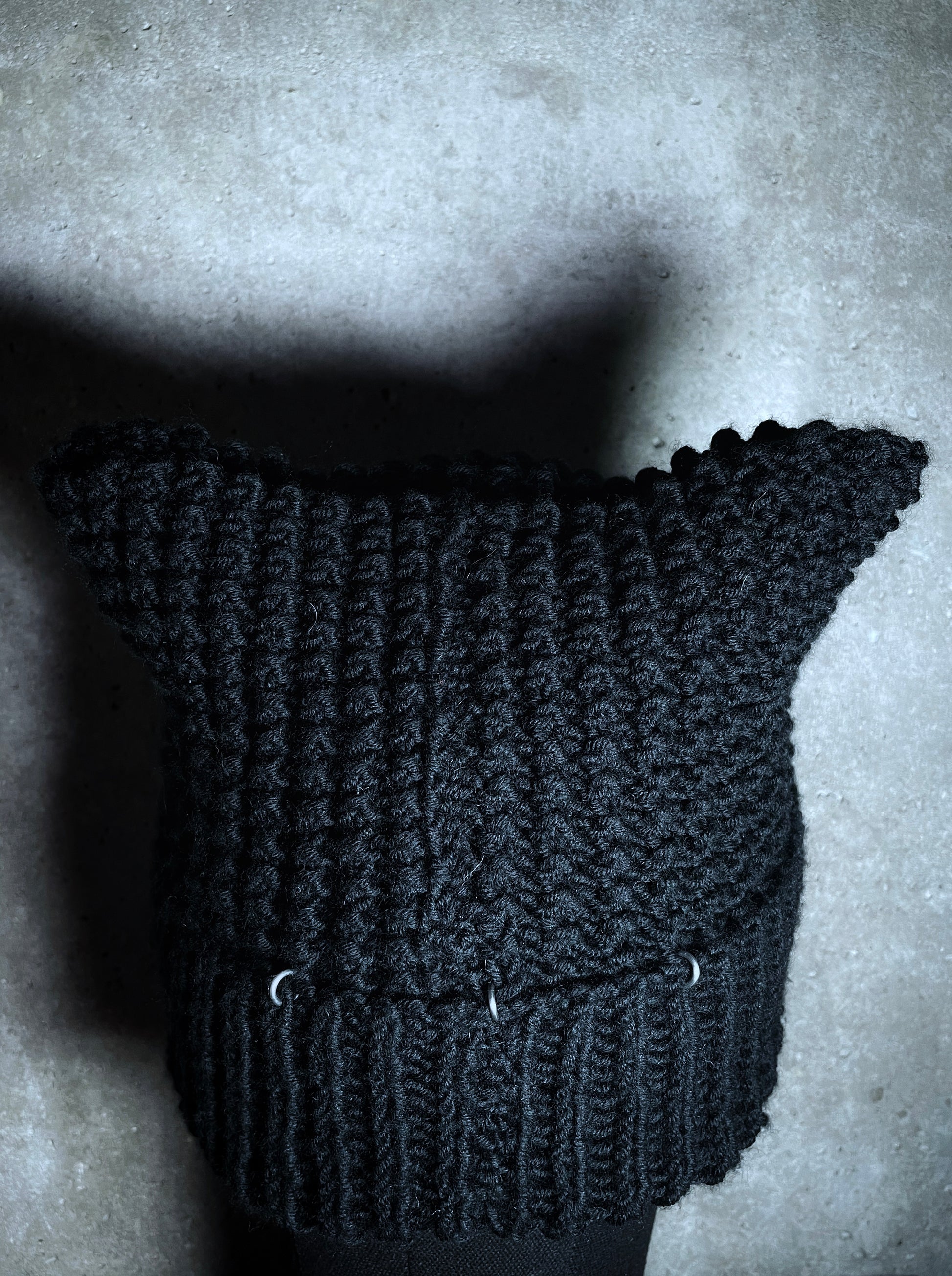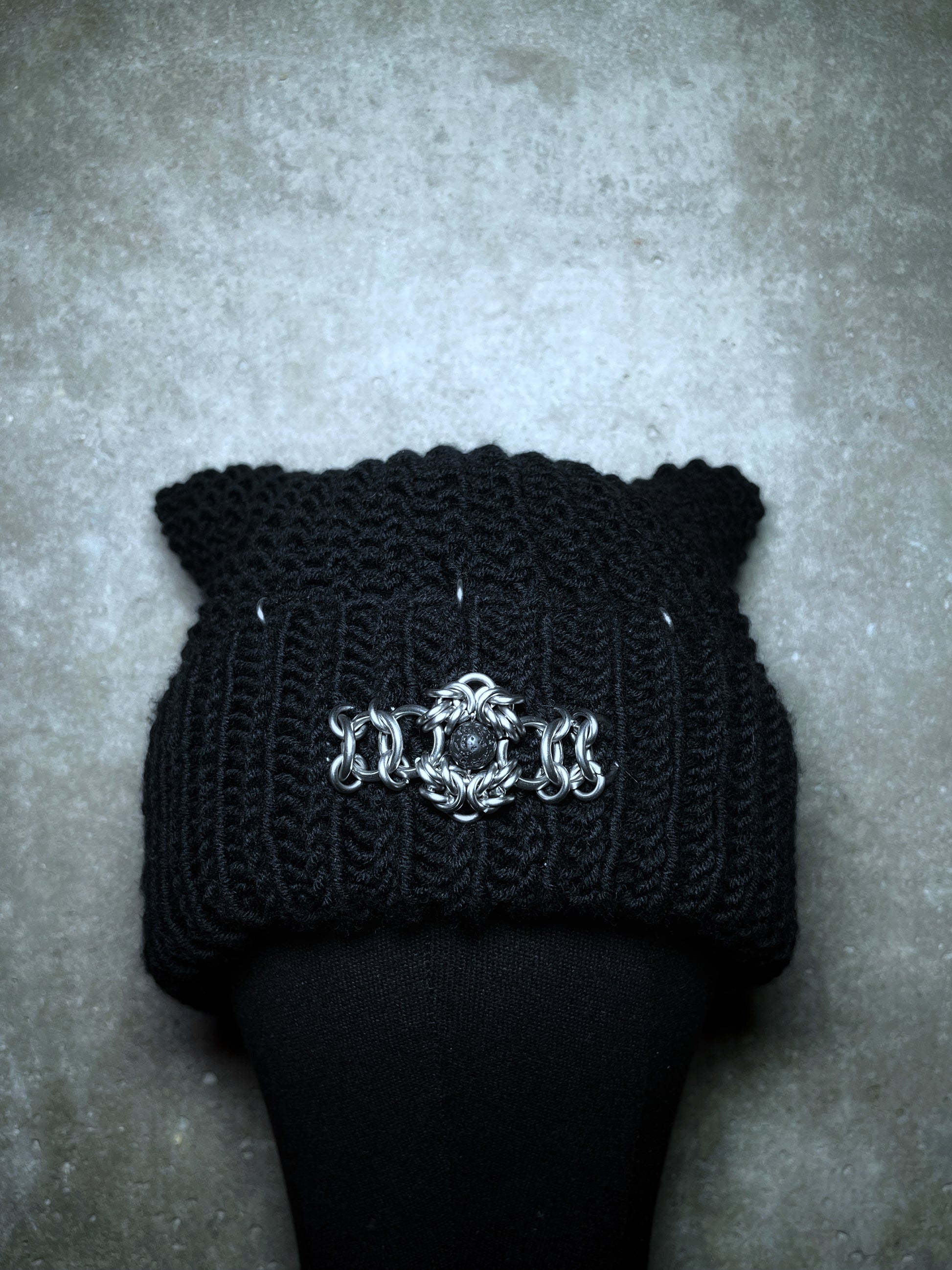 Le bonnet est en laine mérinos noire, confectionné à la main.