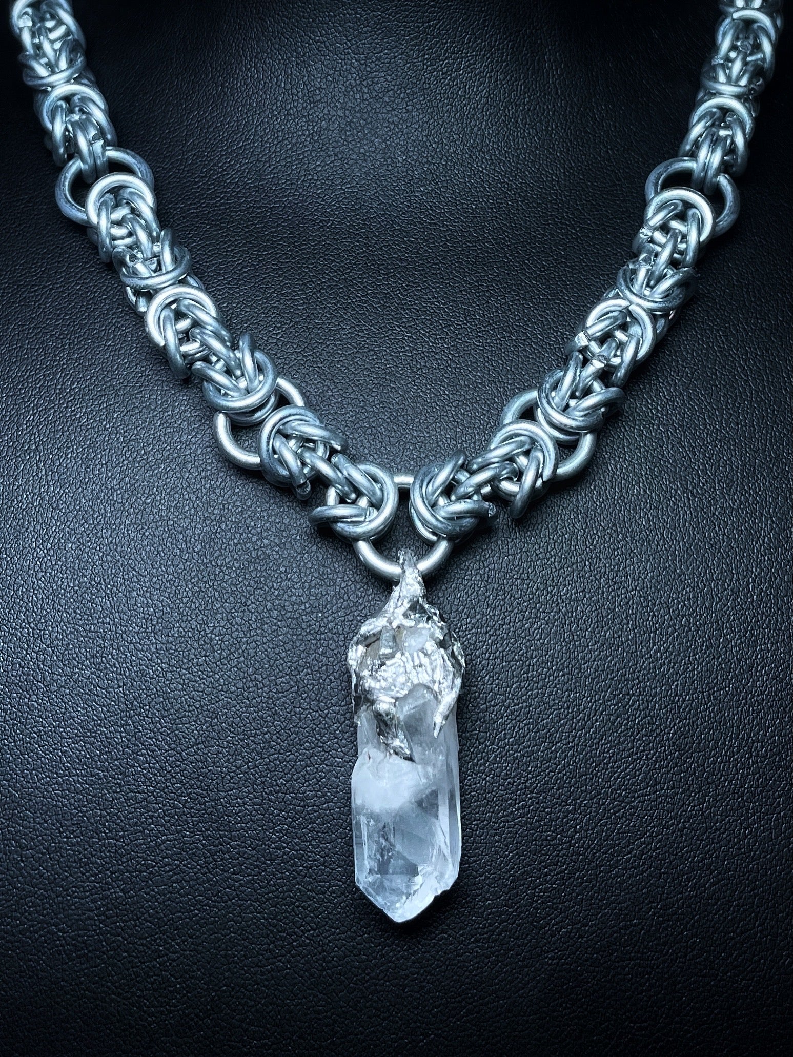 L'ornement, entourant le cristal de roche, est façonné à la main, grâce à une soudure à l'étain.