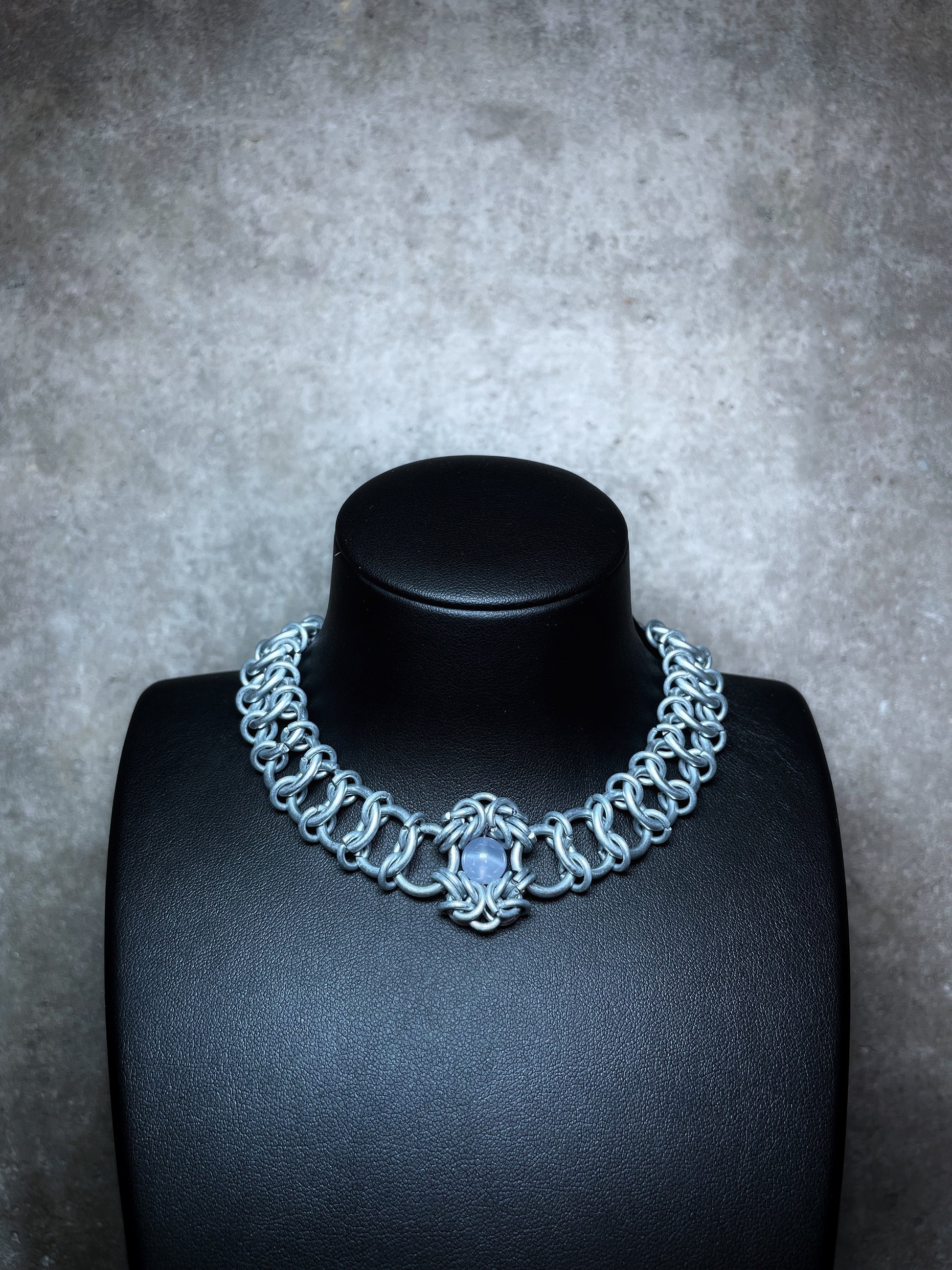 Composée d'anneaux en acier galvanisé, d'une graine Larme de Job, d'une calcédoine bleue et d'un fermoir mousqueton en acier placage argent.