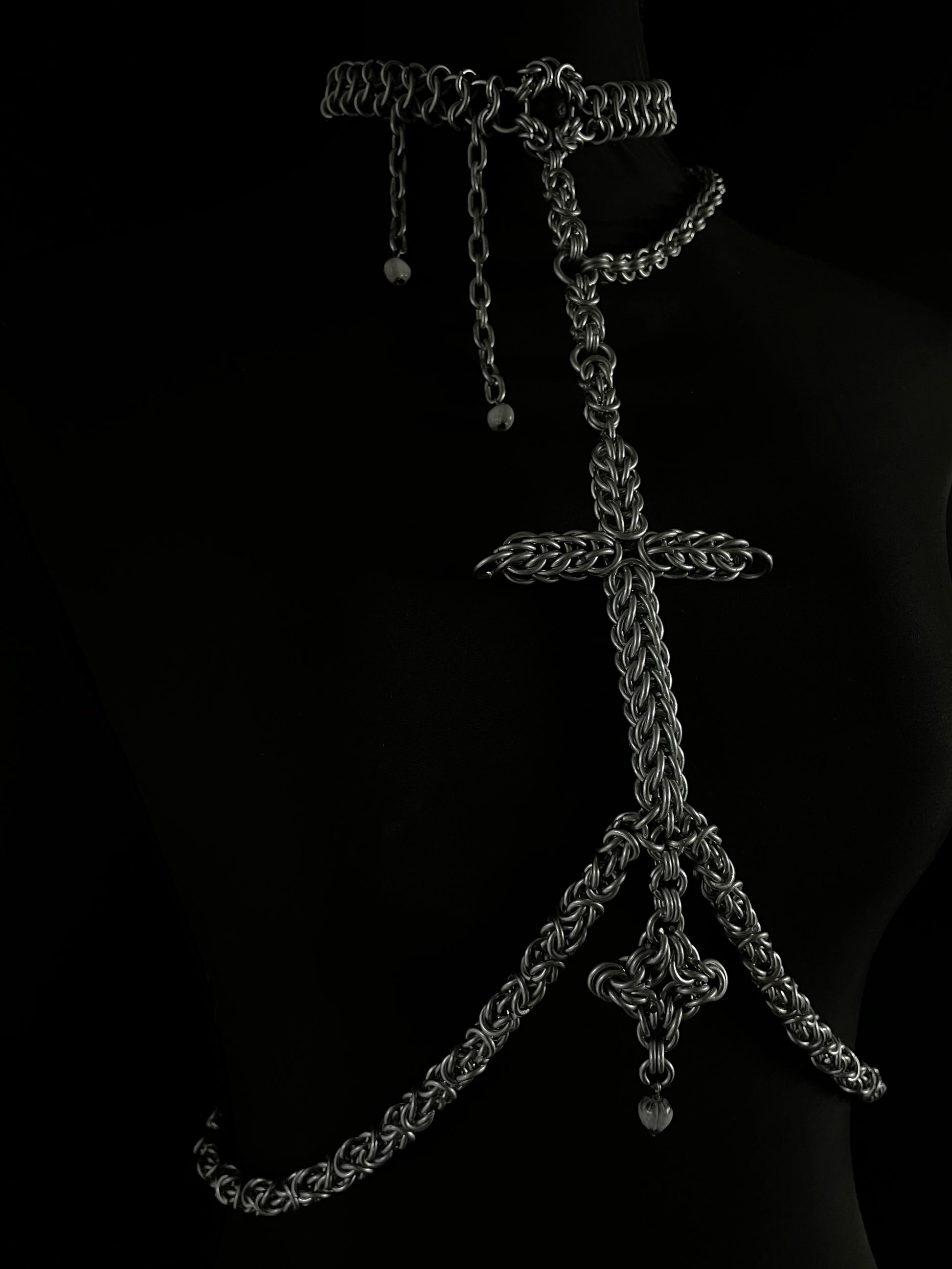Longueur avant, entre le haut du collier (gorge) et le bas de l'étoile (plexus) : 31cm.