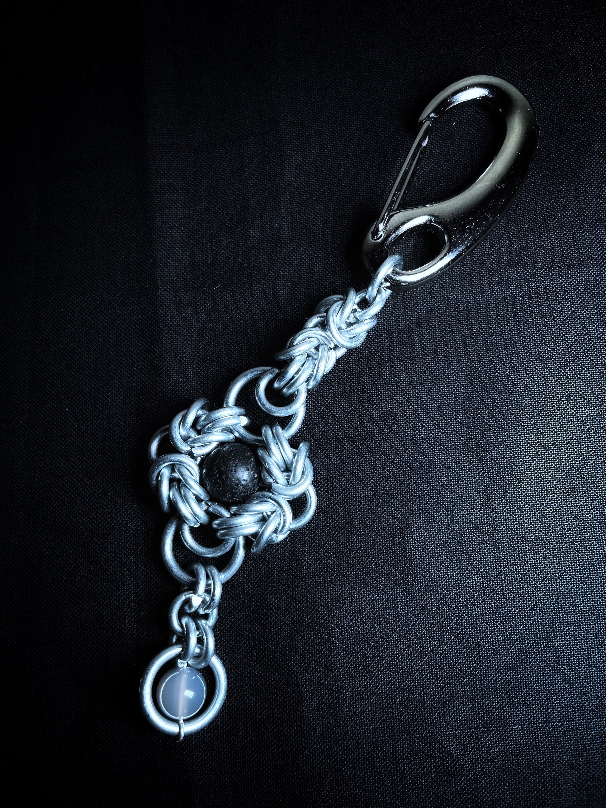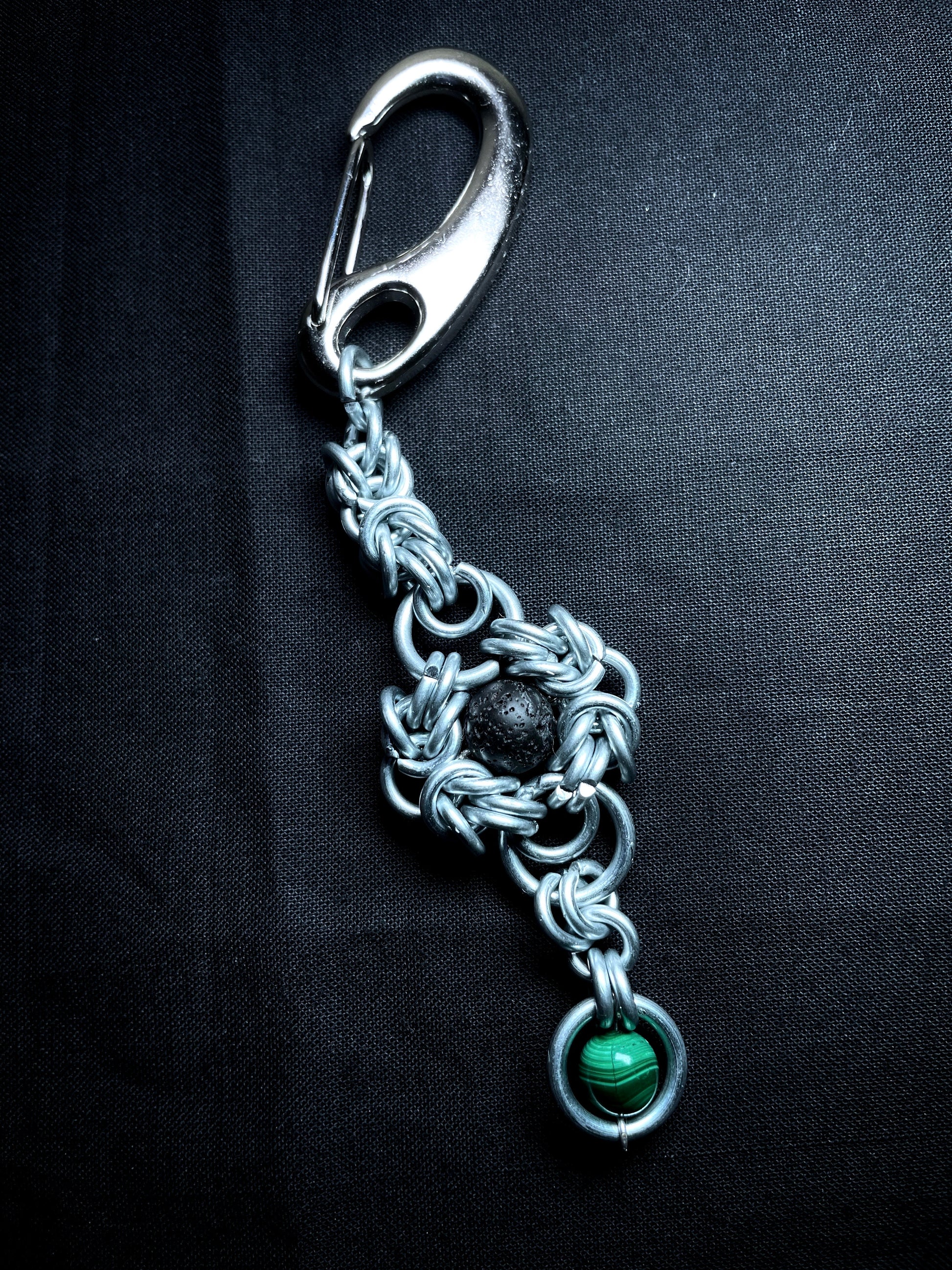 Composée d'anneau en acier galvanisé, de deux pierres naturelles et d'un fermoir mousqueton en acier inoxydable.