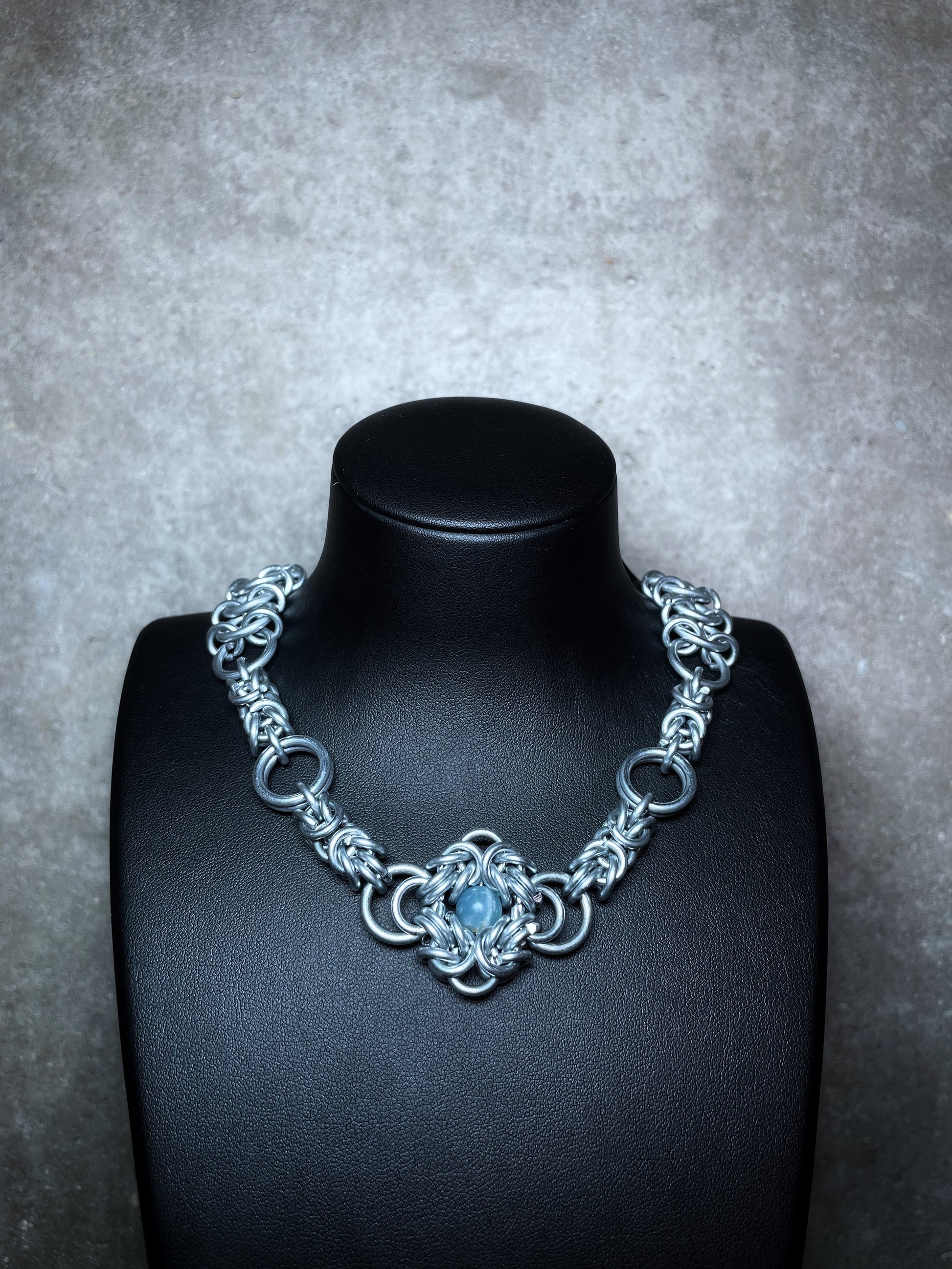 Composée d'anneau en acier galvanisé, d'une graine Larme de Job, d'un onyx bleu et d'un fermoir mousqueton en acier inoxydable.
