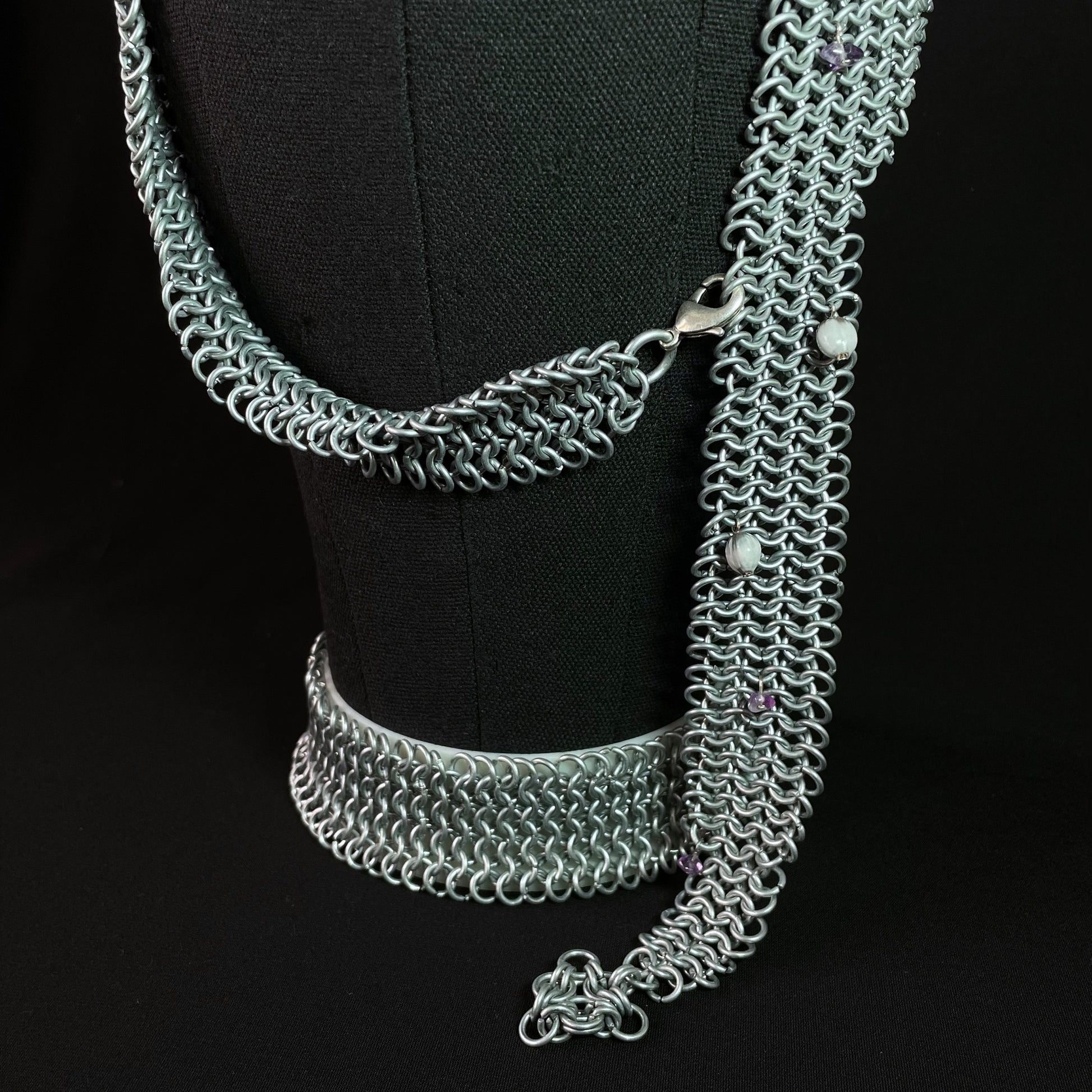 Les anneaux sont fabriqués à partir d'un fil en acier galvanisé, formé en rouleaux et soigneusement découpé à l'aide d'une pince coupante. Ces anneaux sont ensuite assemblés pour former la création VOILE.DE.METAL.